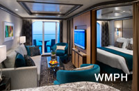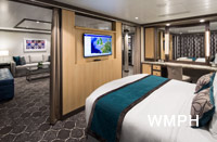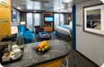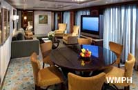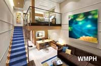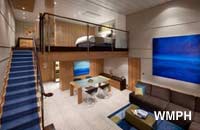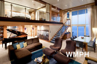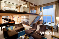Occupancy: 6 The Royal Loft Suite is two decks high and features panoramic views. On the second level, the master bedroom has a King size bed with Duxiana Mattress; and private bathroom ... Read More The Royal Loft Suite is two decks high and features panoramic views. On the second level, the master bedroom has a King size bed with Duxiana Mattress; and private bathroom with tub, shower, two sinks and bidet and a closet. On the main level, there is a second bedroom with closet, and two twin beds that convert to Royal King; an open dining area with dry bar, and a living room with a sofa that converts to a double bed; as well as a second bathroom with shower. The private balcony has a whirlpool and dining area. Read Less Cabin Size: 1,524 sq ft Balcony Size: 843 sq ft