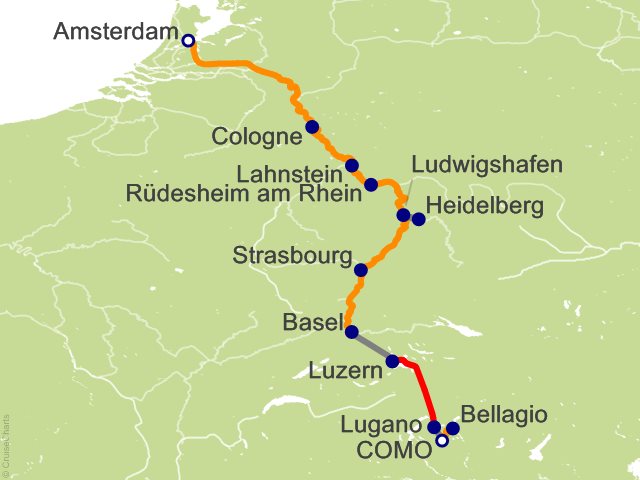 Check out of your Lake Como hotel and transfer via motorcoach to Lugano, where you will board a train to Lucerne. Once in Lucerne, be treated to an orientation tour of the beautiful city and enjoy lunch on your own before driving to Basel, where you will embark your ship for your Swiss Alps & Rhine Castles (Christmas) cruise. (B,D) ...