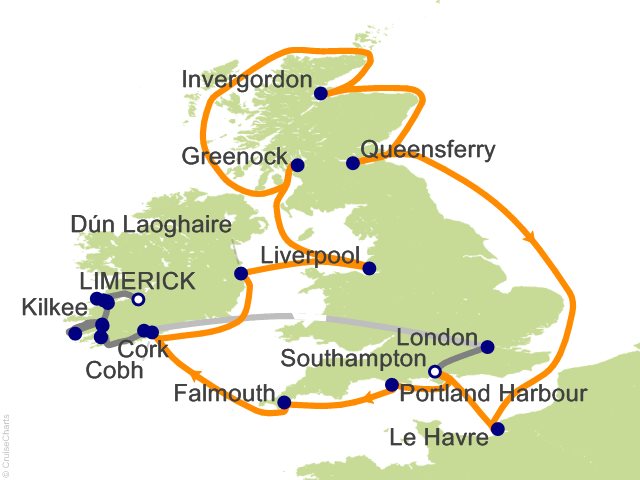 After breakfast, transfer to Cork Airport for your flight to London (Heathrow). Upon arrival, transfer to Southampton to embark your ship. (B)