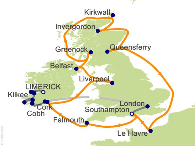After breakfast, transfer to Cork Airport for your flight to London (Heathrow). Upon arrival, transfer to Southampton to embark your ship. (B)