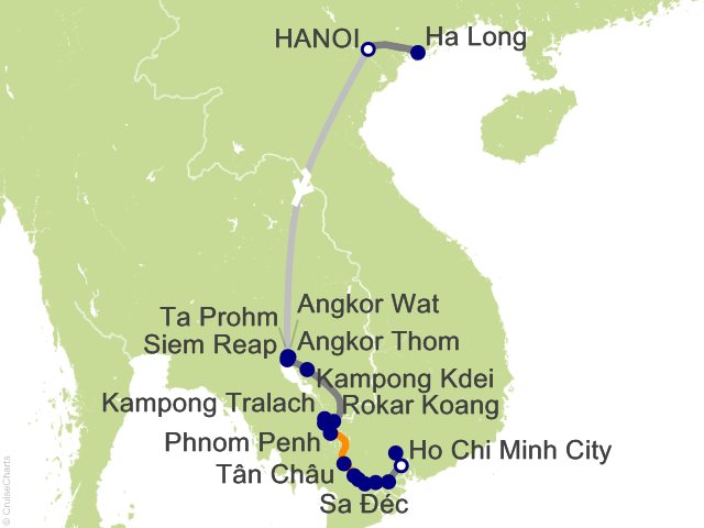 After sailing from My Tho, you'll leave the Mekong Delta and enter the Cho Gao canal, considered one of Vietnam's major arterial canals that connects Tien Giang Province with Ho Chi Minh City. Today, you'll be fascinated watching the heavy commercial traffic navigating this important waterway, where upwards of 1,800 vessels transit each day. Relax onboard, taking in the everchanging vistas of mangroves, cargo barges, and local fishing boats. Tonight, you'll dock in the heart of Ho Chi Minh City, where you can admire the city lights; due to Vietnamese customs regulations, you'll not be permitted to venture ashore. ... Read More