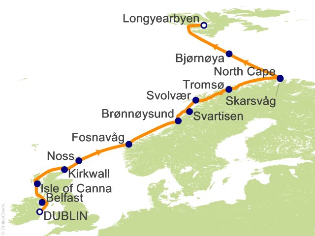From Dublin, (Ireland) to Longyearbyen, (Norway)