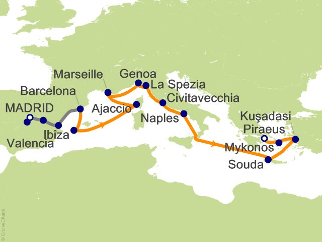From Madrid, (Spain) to Athens (Port of Piraeus), (Greece)