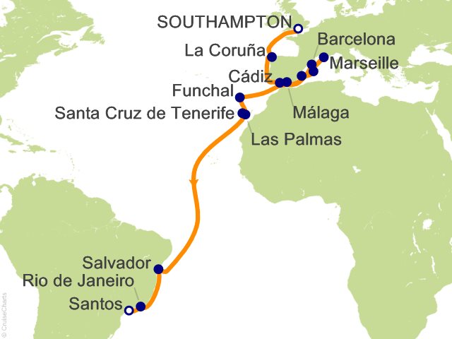 From Southampton, (United Kingdom) to Santos (Sao Paulo), (Brazil)